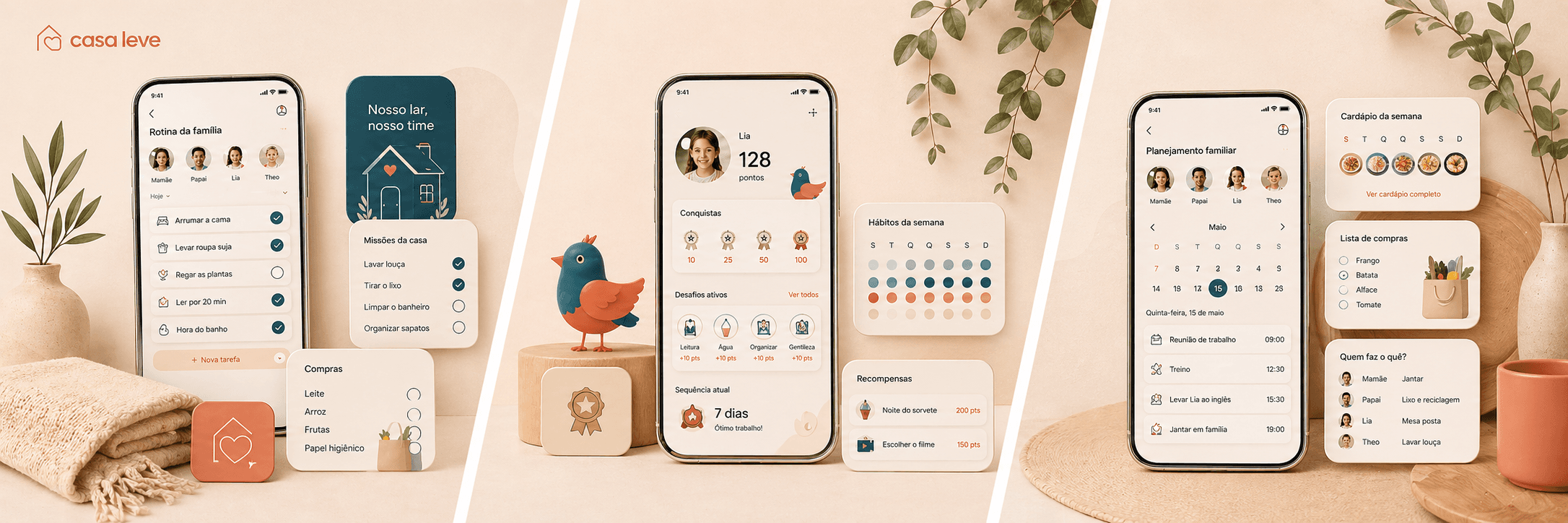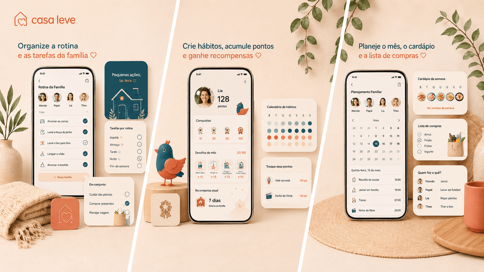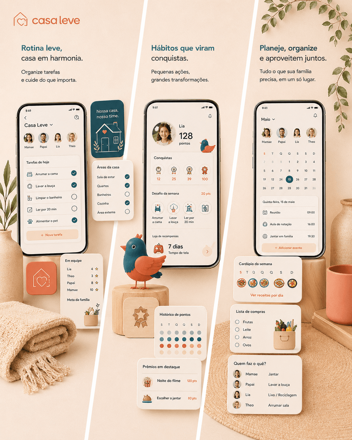 Rotina, responsabilidades, hábitos e colaboração em um só lugar. Menos cobrança, mais clareza, mais autonomia.